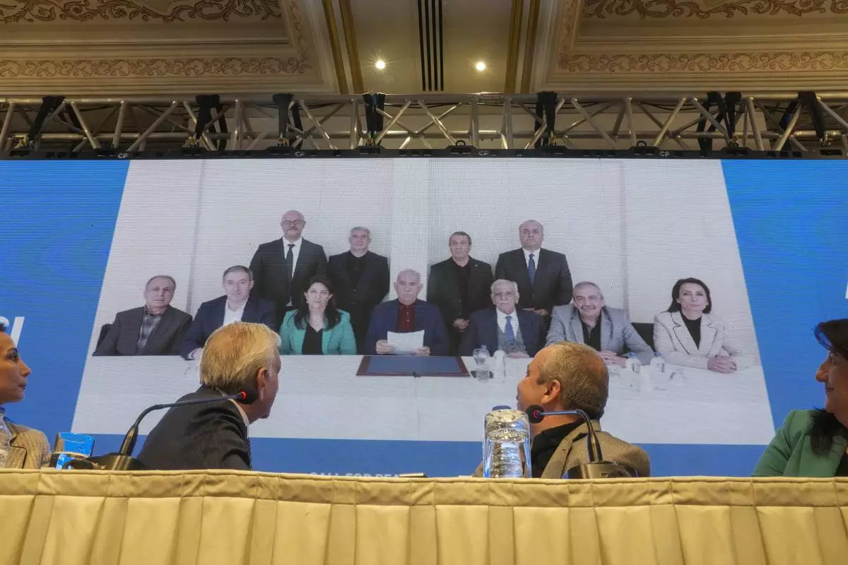 Pro-Kurdish Peoples' Equality and Democracy Party, or DEM, delegation members release an statement from the jailed leader of the rebel Kurdistan Workers' Party, or PKK, Abdullah Ocalan, center at the background photo, in Istanbul, Turkey, Thursday, Feb. 27, 2025. (AP Photo/Khalil Hamra)