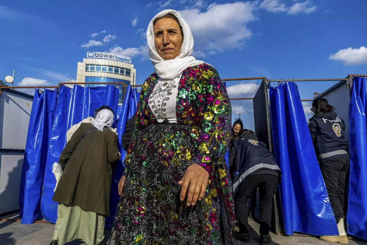 A Kurdish woman arrives to watch live on a tv screen a Pro-Kurdish Peoples' Equality and Democracy Party, or DEM, delegation members releasing an statement from the jailed leader of the rebel Kurdistan Workers' Party, or PKK, Abdullah Ocalan, in Diyarbakir, Turkey, Thursday, Feb. 27, 2025. (AP Photo/Metin Yoksu)