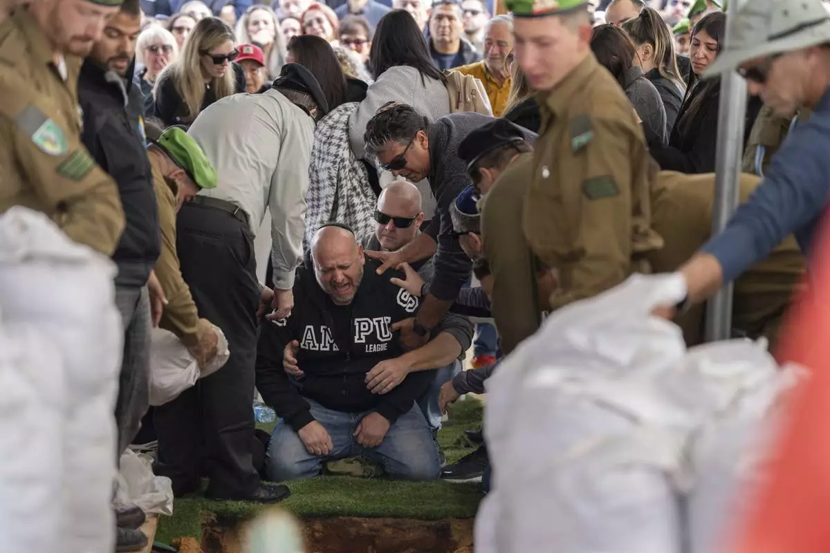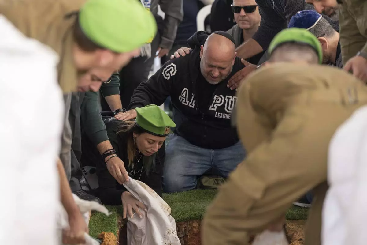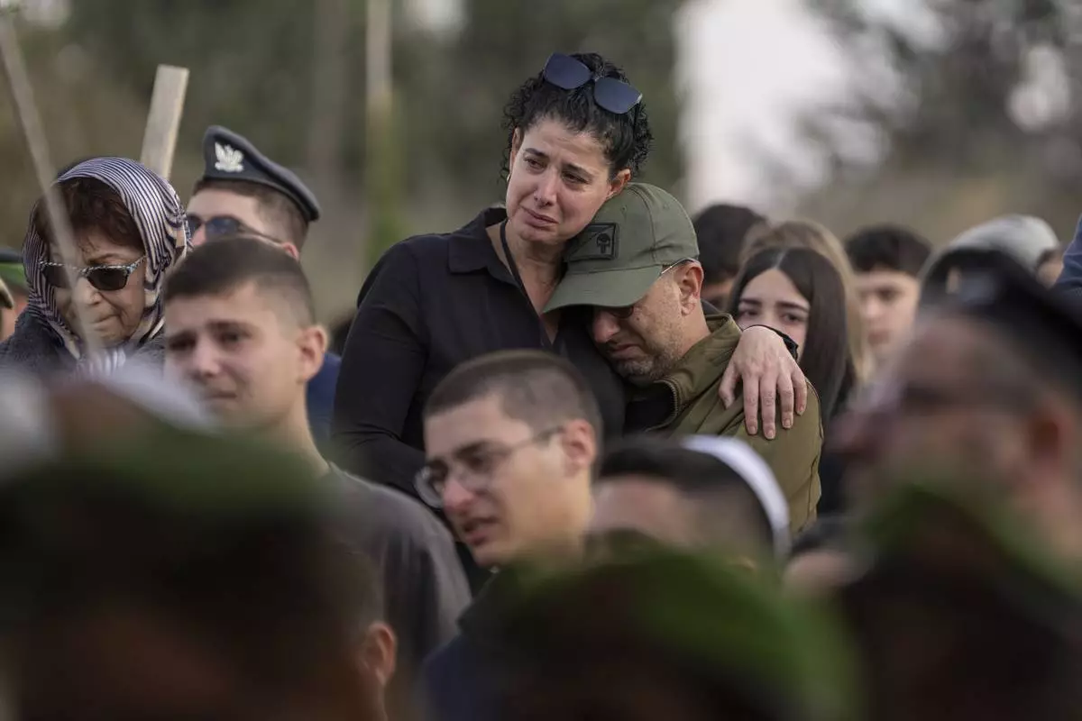 The family of Israeli soldier Sergeant Yahav Maayan who was killed in combat in the Gaza Strip, attends his funeral at a military cemetery in Modiin, Israel, Sunday, Jan. 12, 2025. (AP Photo/Ohad Zwigenberg)