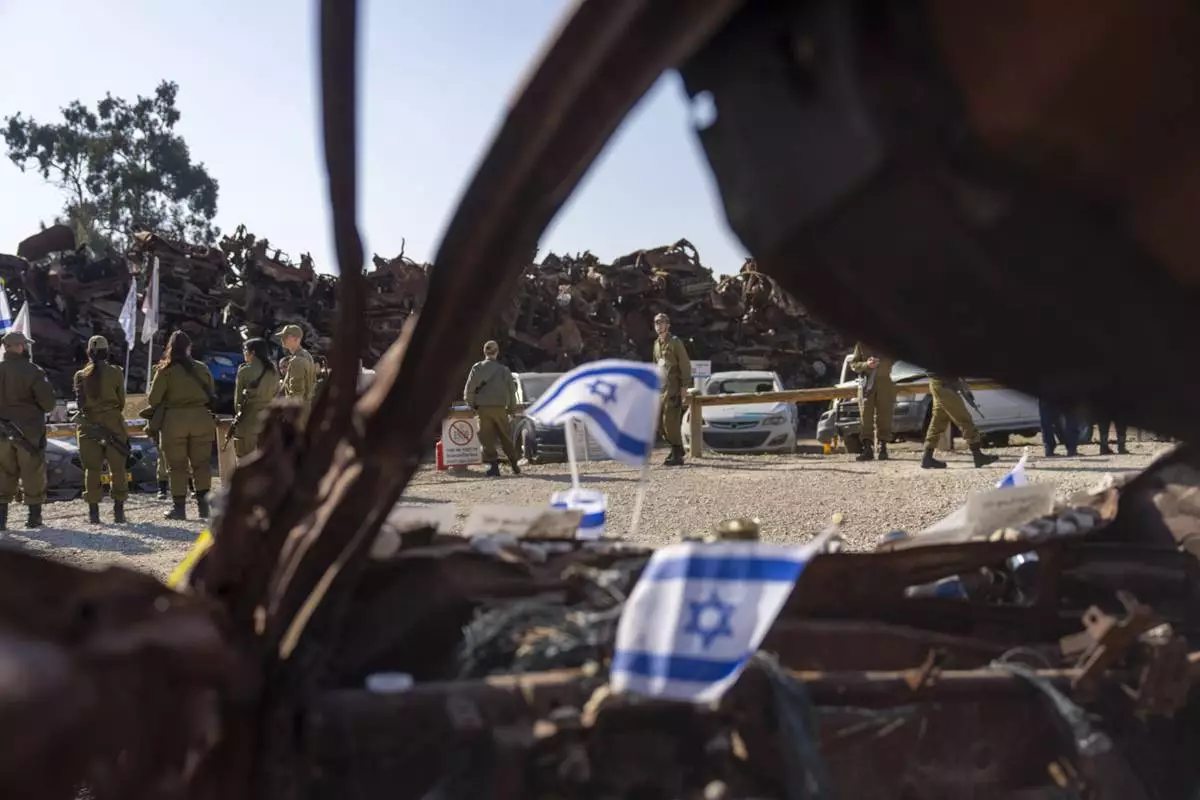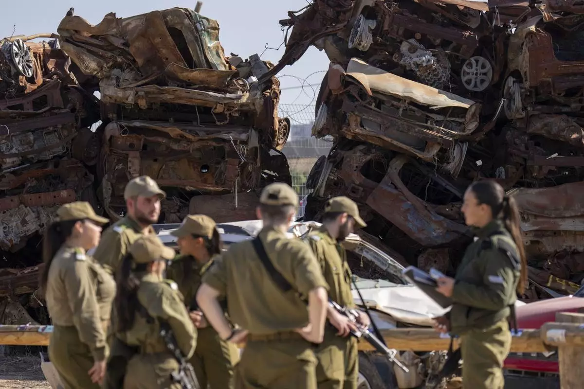 Israeli soldiers look at charred vehicles burned in the Oct. 7 , 2023, cross-border attacks by Hamas militants outside the town of Netivot, southern Israel, Monday, Jan. 13, 2025. (AP Photo/Ariel Schalit)