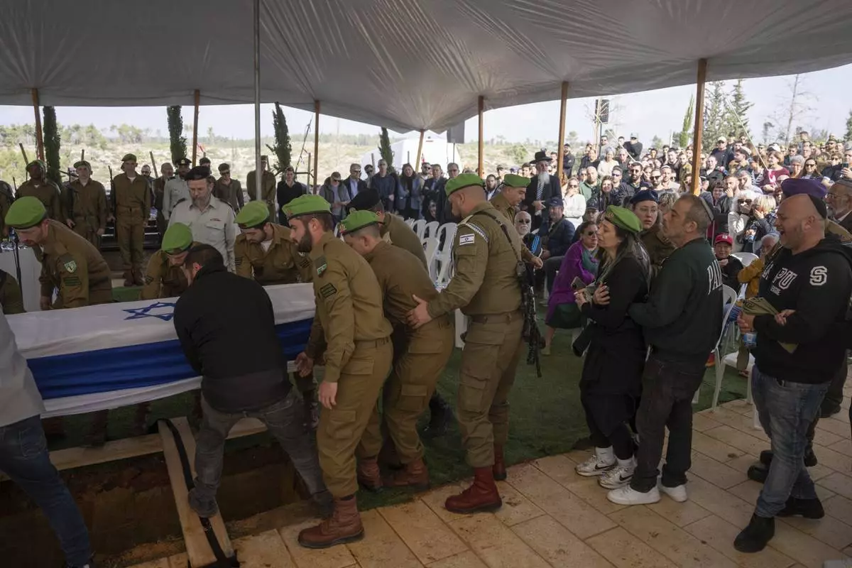 Israeli soldiers and relatives carry the flag-draped casket of Sergeant Yahav Maayan, who was killed in combat in the Gaza Strip, during his funeral at a military cemetery in Modiin, Israel, Sunday, Jan. 12, 2025. (AP Photo/Ohad Zwigenberg)
