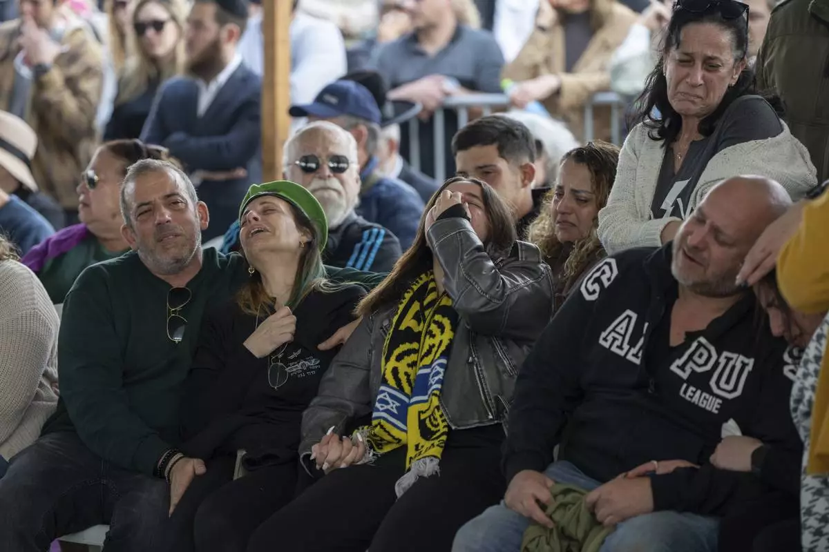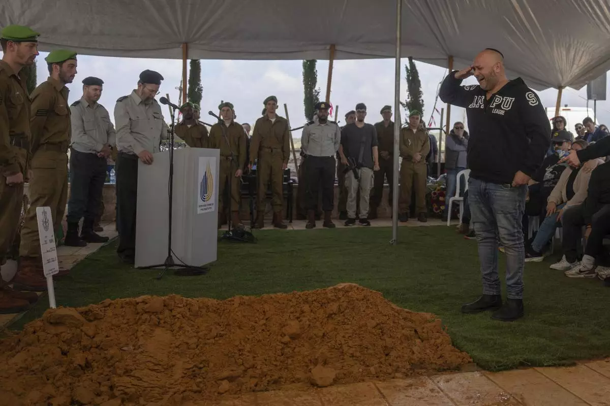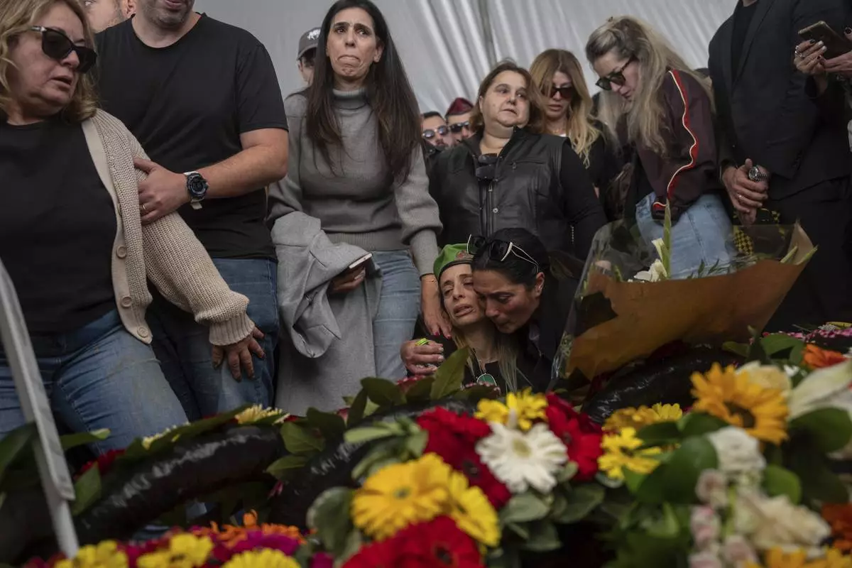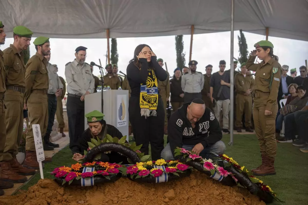 Mourners attend the funeral of Israeli soldier Sergeant Yahav Maayan who was killed in combat in the Gaza Strip, during his funeral at a military cemetery in Modiin, Israel, Sunday, Jan. 12, 2025. (AP Photo/Ohad Zwigenberg)