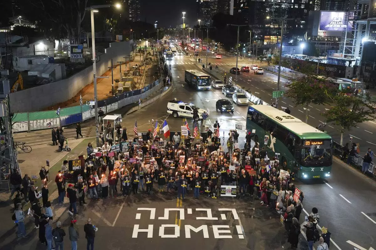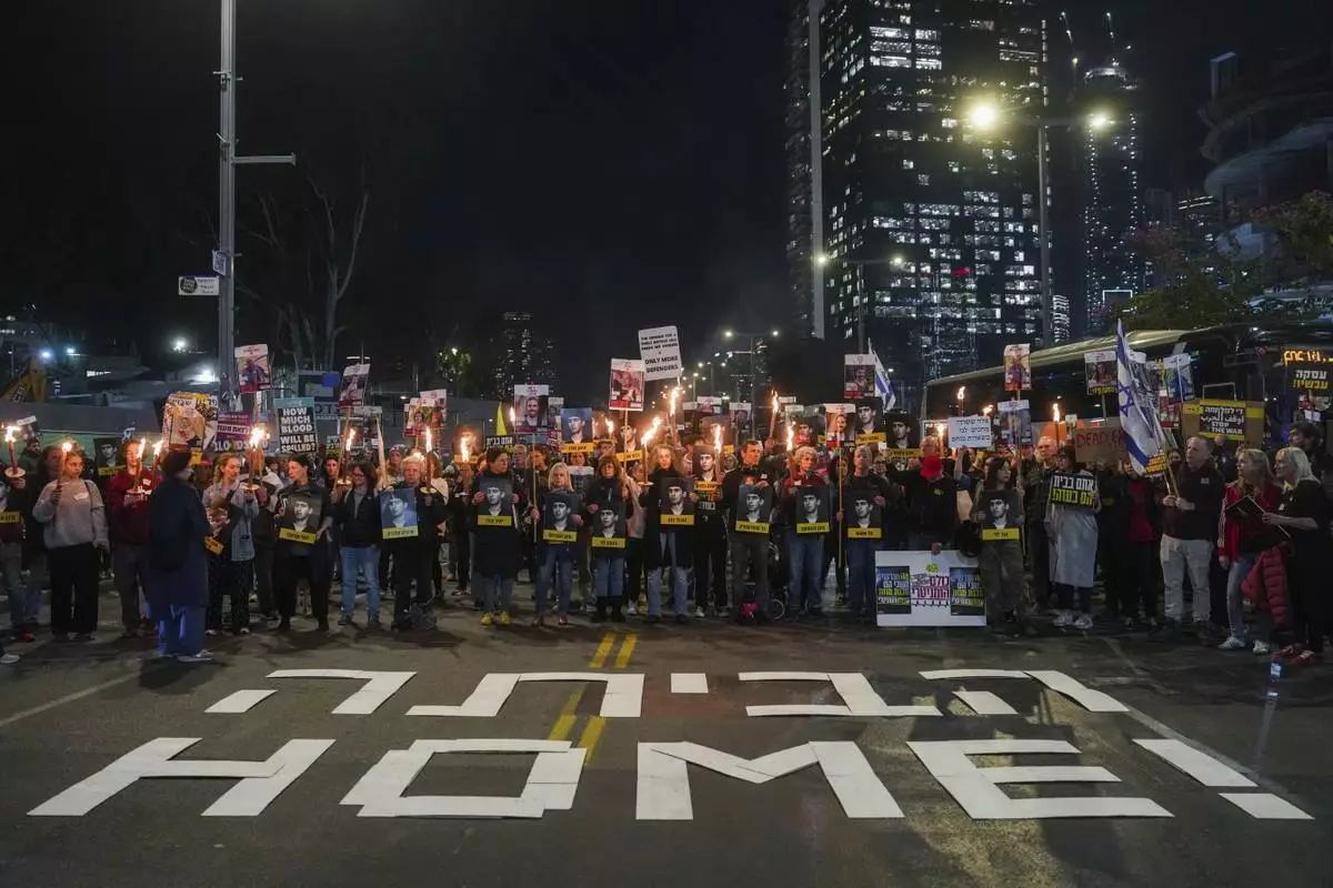 Demonstrators hold torches during a protest calling for the immediate release of the hostages held in the Gaza Strip by the Hamas militant group in Tel Aviv, Israel, on Monday, Jan. 13, 2025. (AP Photo/Ohad Zwigenberg)