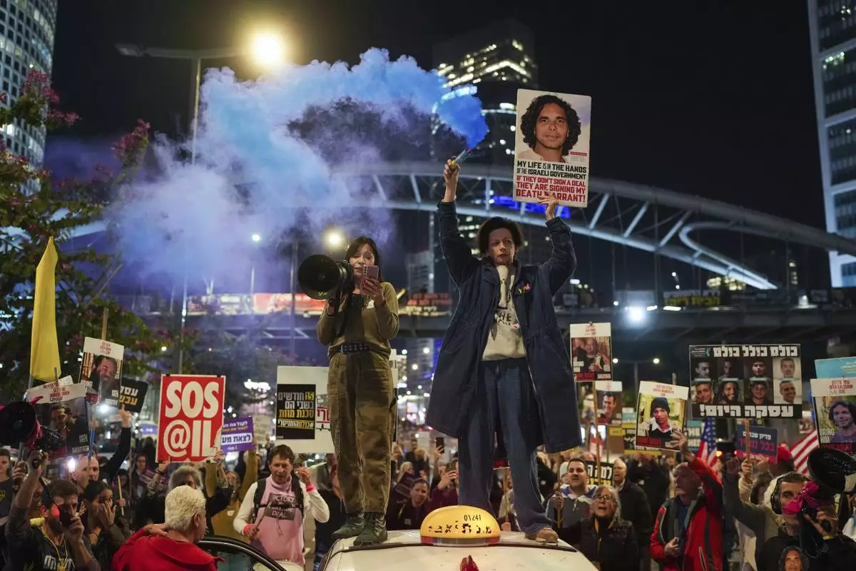 Demonstrators hold signs and flares during a protest calling for the immediate release of the hostages held in the Gaza Strip by the Hamas militant group in Tel Aviv, Israel, on Monday, Jan. 13, 2025. (AP Photo/Ohad Zwigenberg)