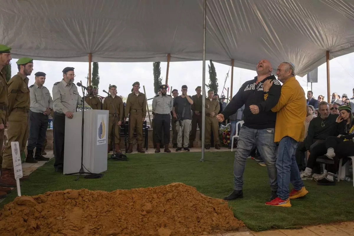 Gali and Nir, the parents of Israeli soldier Sergeant Yahav Maayan who was killed in combat in the Gaza Strip, react next to his grave during his funeral at a military cemetery in Modiin, Israel, Sunday, Jan. 12, 2025. (AP Photo/Ohad Zwigenberg)