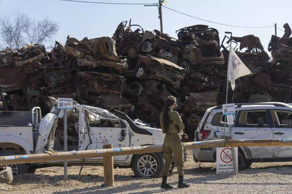 An Israeli soldier looks at charred vehicles burned in the Oct. 7 , 2023, cross-border attacks by Hamas militants outside the town of Netivot, southern Israel, Monday, Jan. 13, 2025. (AP Photo/Ariel Schalit)