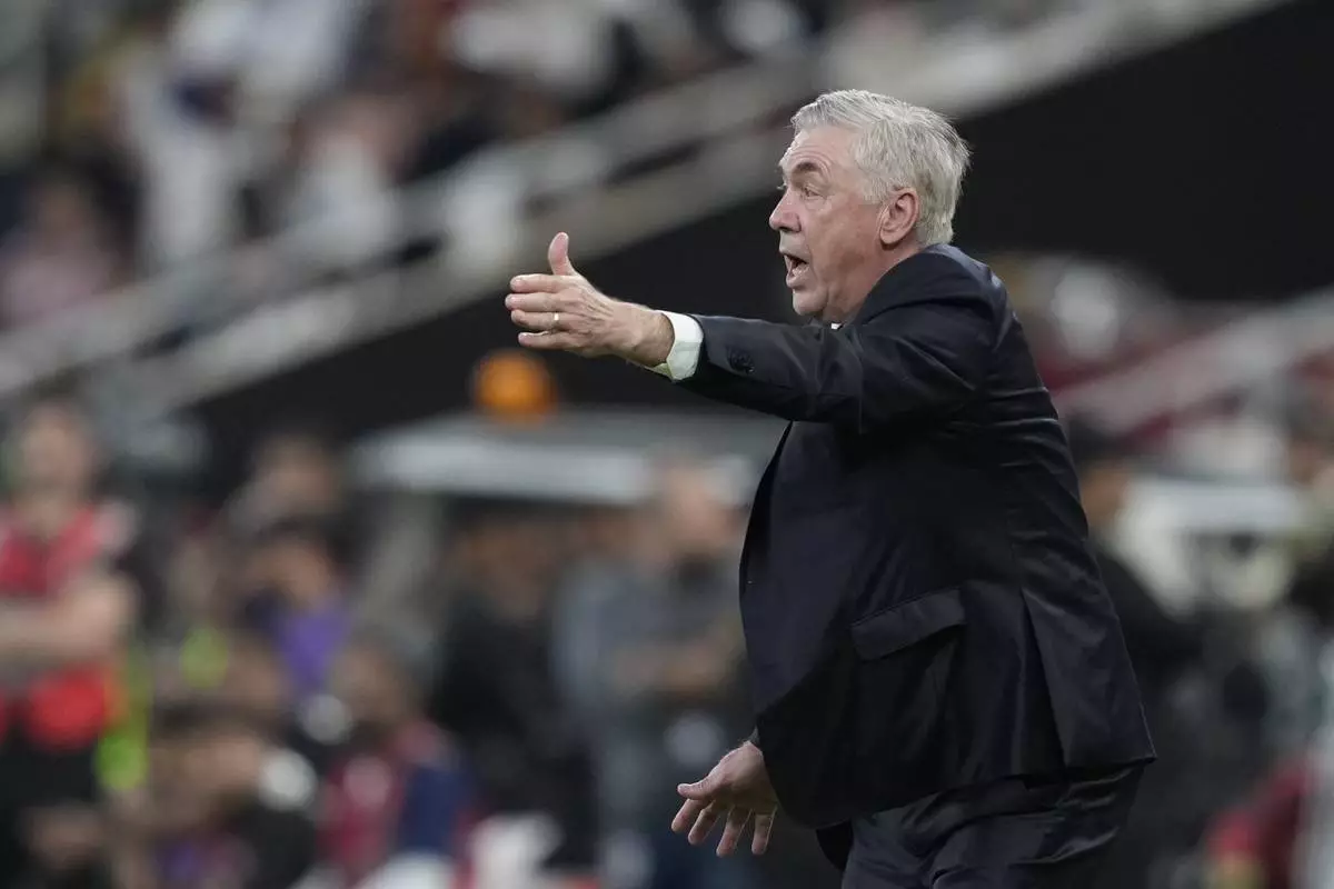 Real Madrid's head coach Carlo Ancelotti gives instructions from the side line during the Spain Super Cup final soccer match between Real Madrid and Barcelona at King Abdullah Stadium in Jeddah, Saudi Arabia, Sunday, Jan. 12, 2025. (AP Photo/Altaf Qadri)