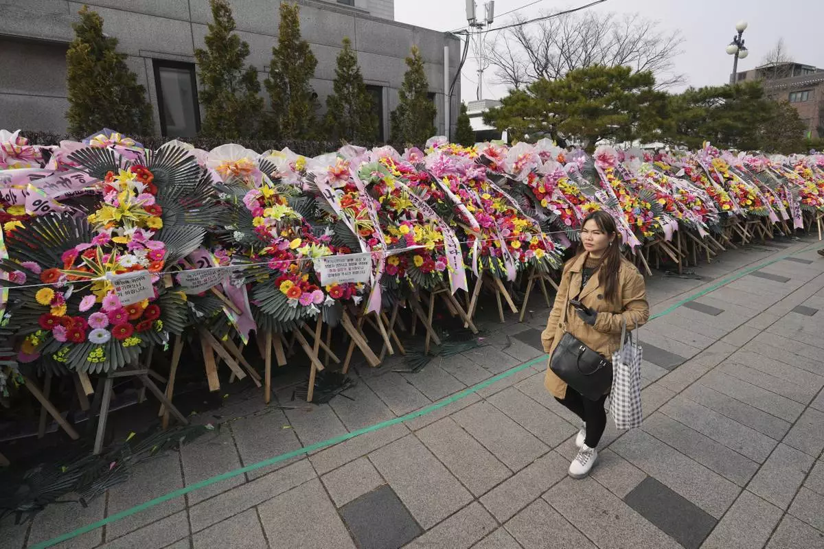 A pedestrian passes by the wreaths sent by supporters of impeached South Korean President Yoon Suk Yeol outside of the Constitutional Court in Seoul, South Korea, Tuesday, Jan. 14, 2025. (AP Photo/Lee Jin-man)