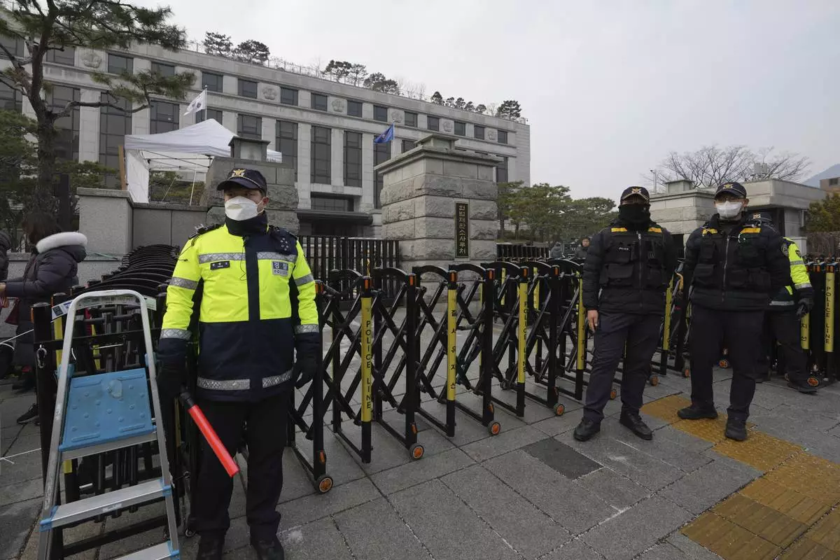 South Korean police officers stand in front of the Constitutional Court in Seoul, South Korea, Tuesday, Jan. 14, 2025. (AP Photo/Lee Jin-man)