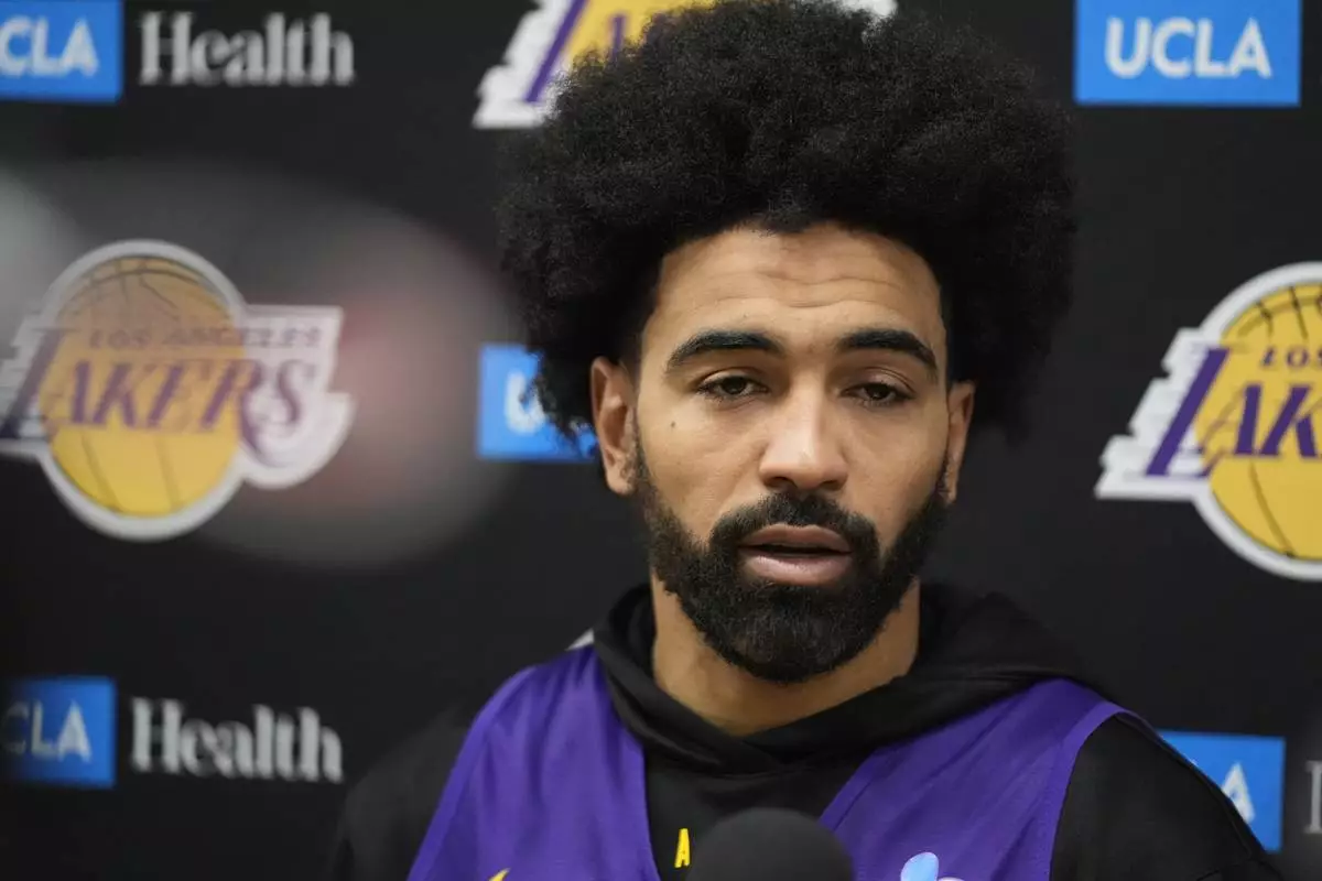Los Angeles Lakers guard Gabe Vincent comments on the wildfires during an NBA basketball news conference at the UCLA Health Training Center in El Segundo, Calif., Friday, Jan. 10, 2025. (AP Photo/Damian Dovarganes)
