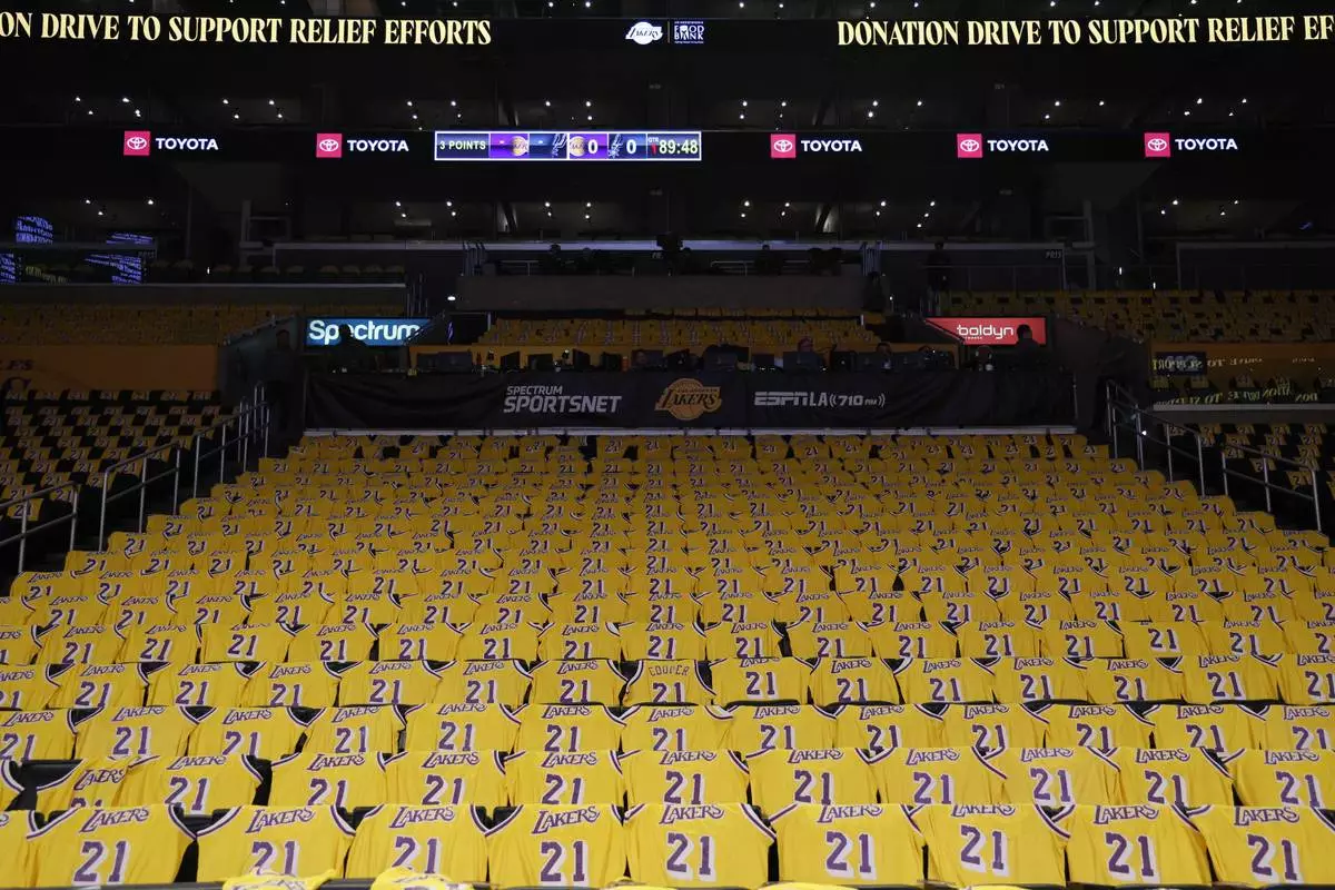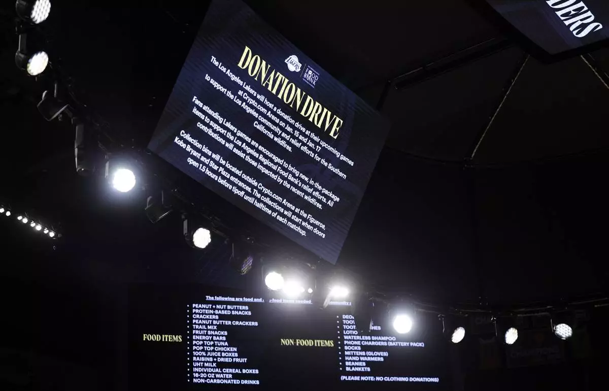 The Lakers staged a donation drive outside their arena before they hosted the Spurs, accepting food and packaged personal items. The Lakers and Clippers were among 12 Los Angeles-area pro sports teams that announced Monday they will contribute more than $8 million combined for local relief efforts.