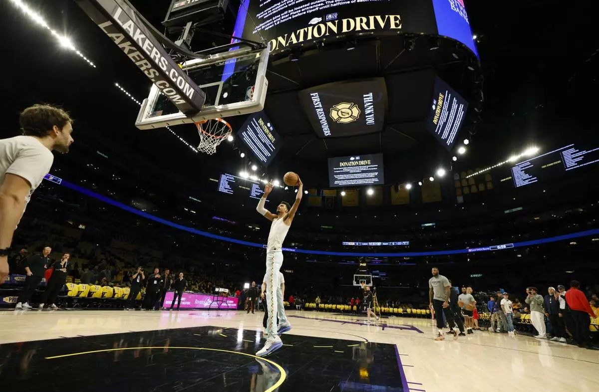 San Antonio Spurs center Victor Wembanyama, center, warms up with signs announcing the Los Angeles Lakers donation drive for California wildfires victims before an NBA basketball game Monday, Jan. 13, 2025, in Los Angeles. (AP Photo/Kevork Djansezian)