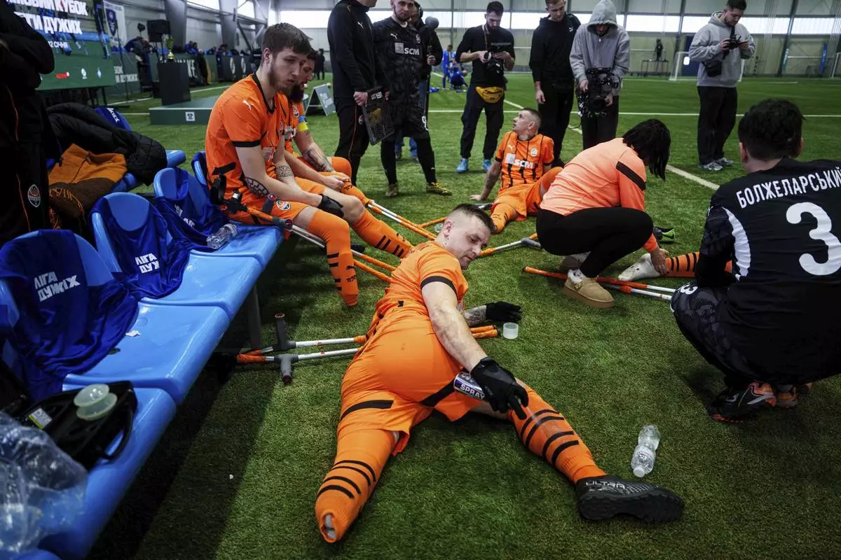 Soccer players of Shakhtar Stalevi rest during Ukraine's first soccer tournament for war-wounded amputees in Kyiv, Ukraine, Jan. 11, 2024. (AP Photo/Evgeniy Maloletka)