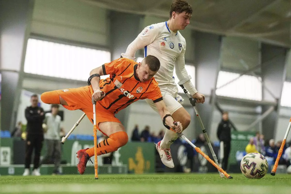 Soccer players of Shakhtar Stalevi and MSK Dnipro play during Ukraine's first soccer tournament for war-wounded amputees in Kyiv, Ukraine, Jan. 11, 2025. (AP Photo/Evgeniy Maloletka)