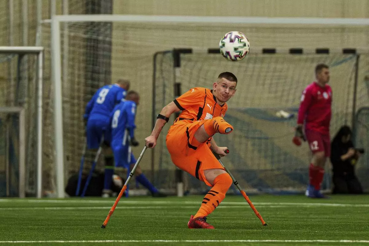 A soccer player of Shakhtar Stalevi play in match against MSK Dnipro during the first football tournament for war-wounded amputees in Kyiv, Ukraine, Jan. 11, 2024. (AP Photo/Evgeniy Maloletka)