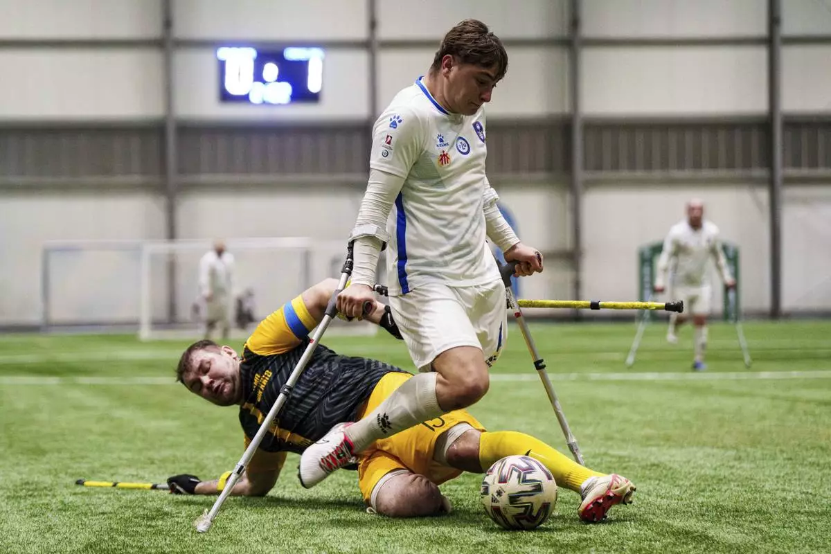 Soccer players of AMP FC Kyiv and MSK Dnipro play during the first football tournament for war-wounded amputees in Kyiv, Ukraine, Jan. 12, 2025. (AP Photo/Evgeniy Maloletka)
