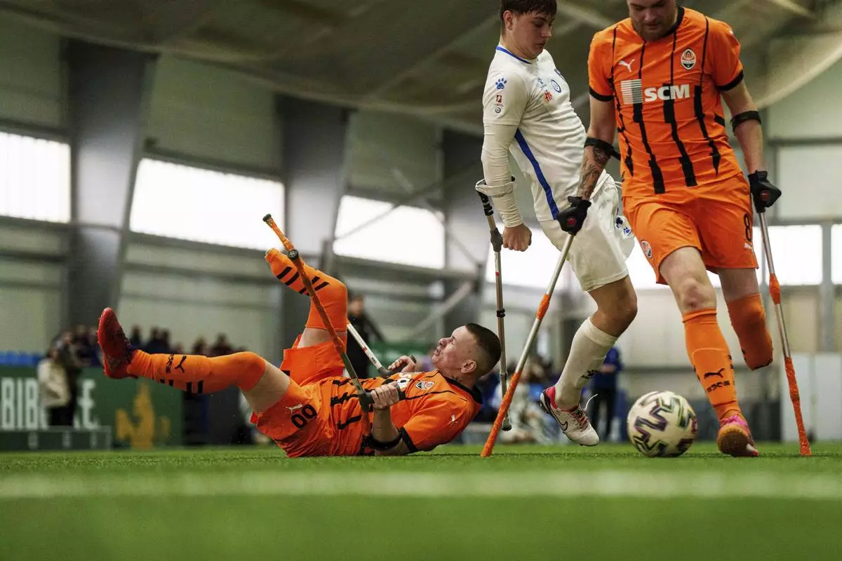 Soccer players of Shakhtar Stalevi and Pokrova FC play during the first football tournament for war-wounded amputees in Kyiv, Ukraine, Jan. 12, 2025. (AP Photo/Evgeniy Maloletka)