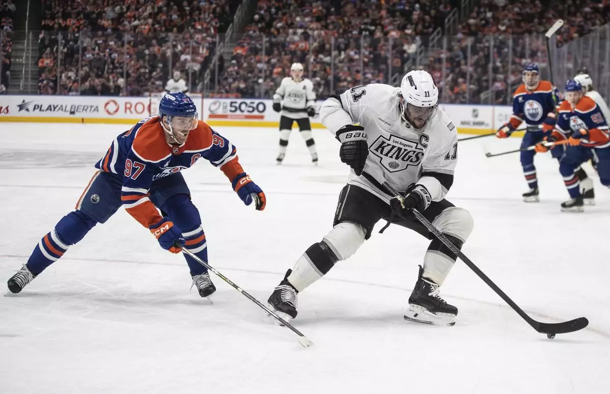 Los Angeles Kings' Anze Kopitar (11) is pursued by Edmonton Oilers' Connor McDavid (97) during first-period NHL hockey game action in Edmonton, Alberta, Monday, Jan. 13, 2025. (Jason Franson/The Canadian Press via AP)