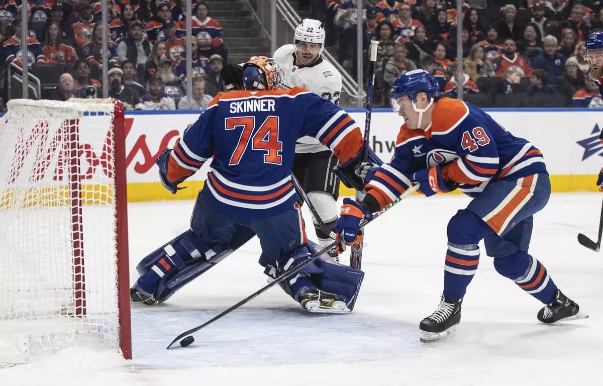 Los Angeles Kings' Kevin Fiala (22) gets the puck past Edmonton Oilers goalie Stuart Skinner (74) as Oilers' Ty Emberson (49) picks it up before it goes into the net during first-period NHL hockey game action in Edmonton, Alberta, Monday, Jan. 13, 2025. (Jason Franson/The Canadian Press via AP)