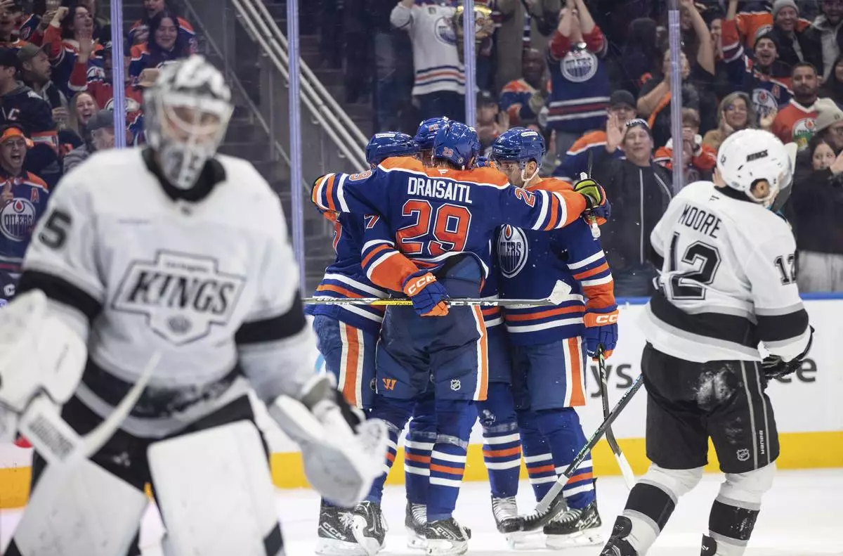 Los Angeles Kings goalie Darcy Kuemper, left, and Trevor Moore (12) look on as Edmonton Oilers celebrate after a goal during second-period NHL hockey game action in Edmonton, Alberta, Monday, Jan. 13, 2025. (Jason Franson/The Canadian Press via AP)