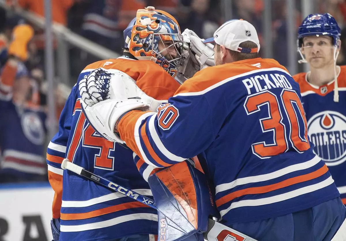 Edmonton Oilers goalie Stuart Skinner (74) and teammate Calvin Pickard (30) celebrate the win over the Los Angeles Kings in an NHL hockey game in Edmonton, Alberta, Monday, Jan. 13, 2025. (Jason Franson/The Canadian Press via AP)