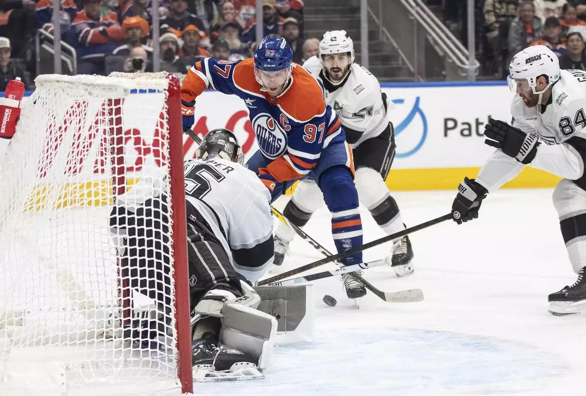 Los Angeles Kings goalie Darcy Kuemper, front left, makes a save against Edmonton Oilers' Connor McDavid (97) during second-period NHL hockey game action in Edmonton, Alberta, Monday, Jan. 13, 2025. (Jason Franson/The Canadian Press via AP)