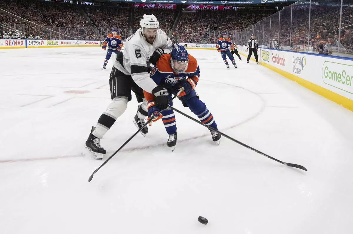 Los Angeles Kings' Joel Edmundson (6) and Edmonton Oilers' Zach Hyman (18) battle for the puck during second-period NHL hockey game action in Edmonton, Alberta, Monday, Jan. 13, 2025. (Jason Franson/The Canadian Press via AP)