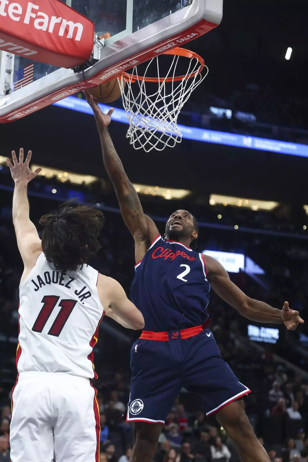 Los Angeles Clippers forward Kawhi Leonard (2) shoots against Miami Heat guard Jaime Jaquez Jr. (11) during the second half of an NBA basketball game, Monday, Jan. 13, 2025, in Los Angeles. (AP Photo/Jessie Alcheh)