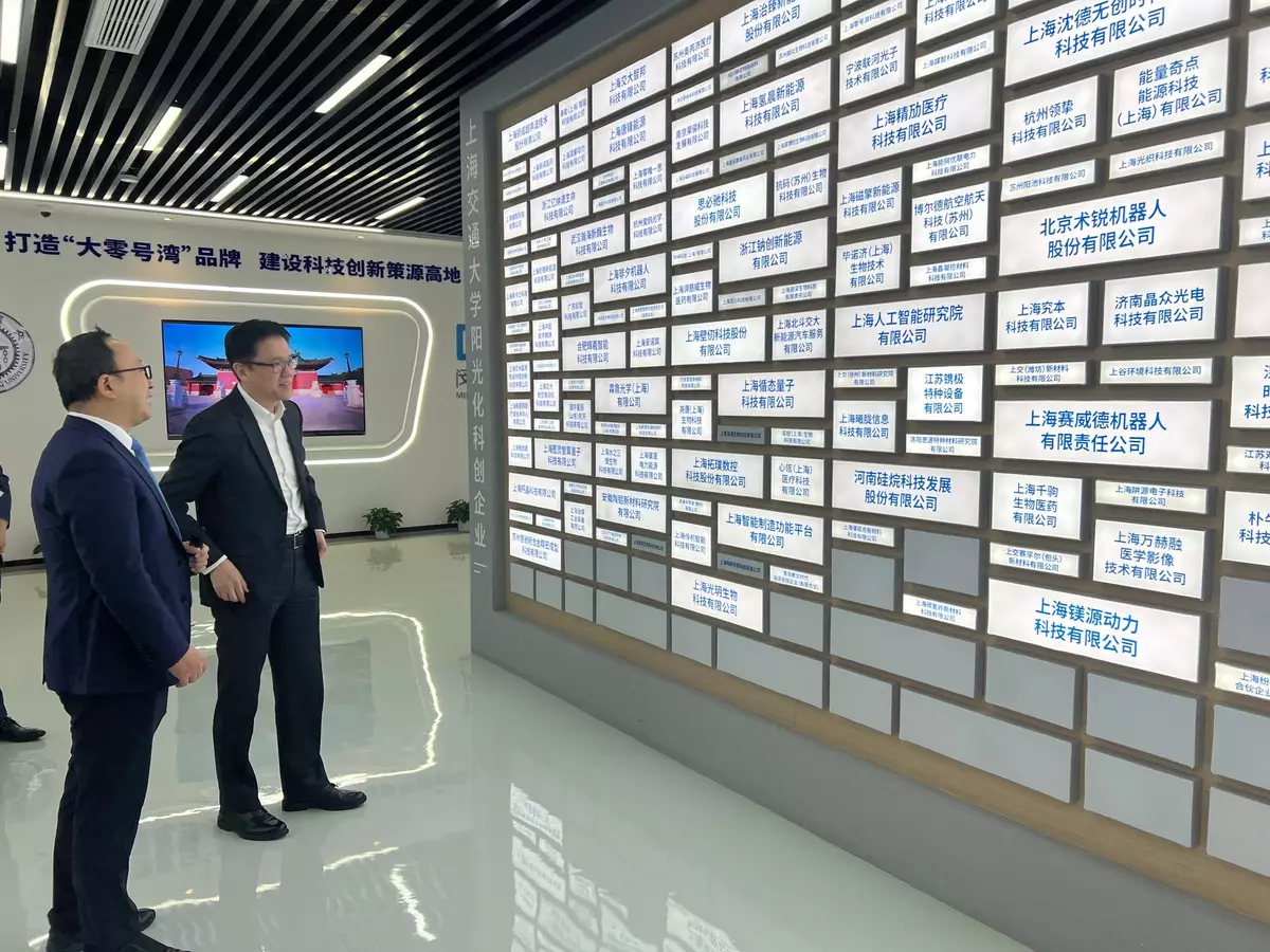 In the morning, Professor Sun visited the GrandneoBay Sci-tech Innovation Park of Shanghai Jiao Tong University (SJTU) and the 1km Incubator exhibition hall. Professor Sun received a briefing on the construction and development plans of this new research and development (R&D) platform as well as the University's technology outcome transformation projects and the experience of teachers and students in starting up businesses, which help promote key industries.