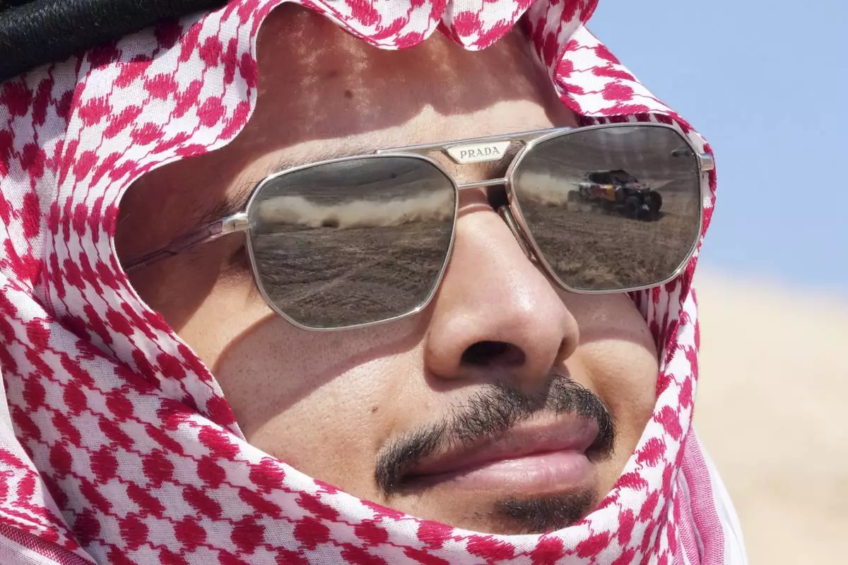A car is reflected in the glasses of a spectator during the ninth stage of the Dakar Rally between Riyadh and Haradh, Saudi Arabia, Tuesday, Jan. 14, 2025. (AP Photo/Christophe Ena)