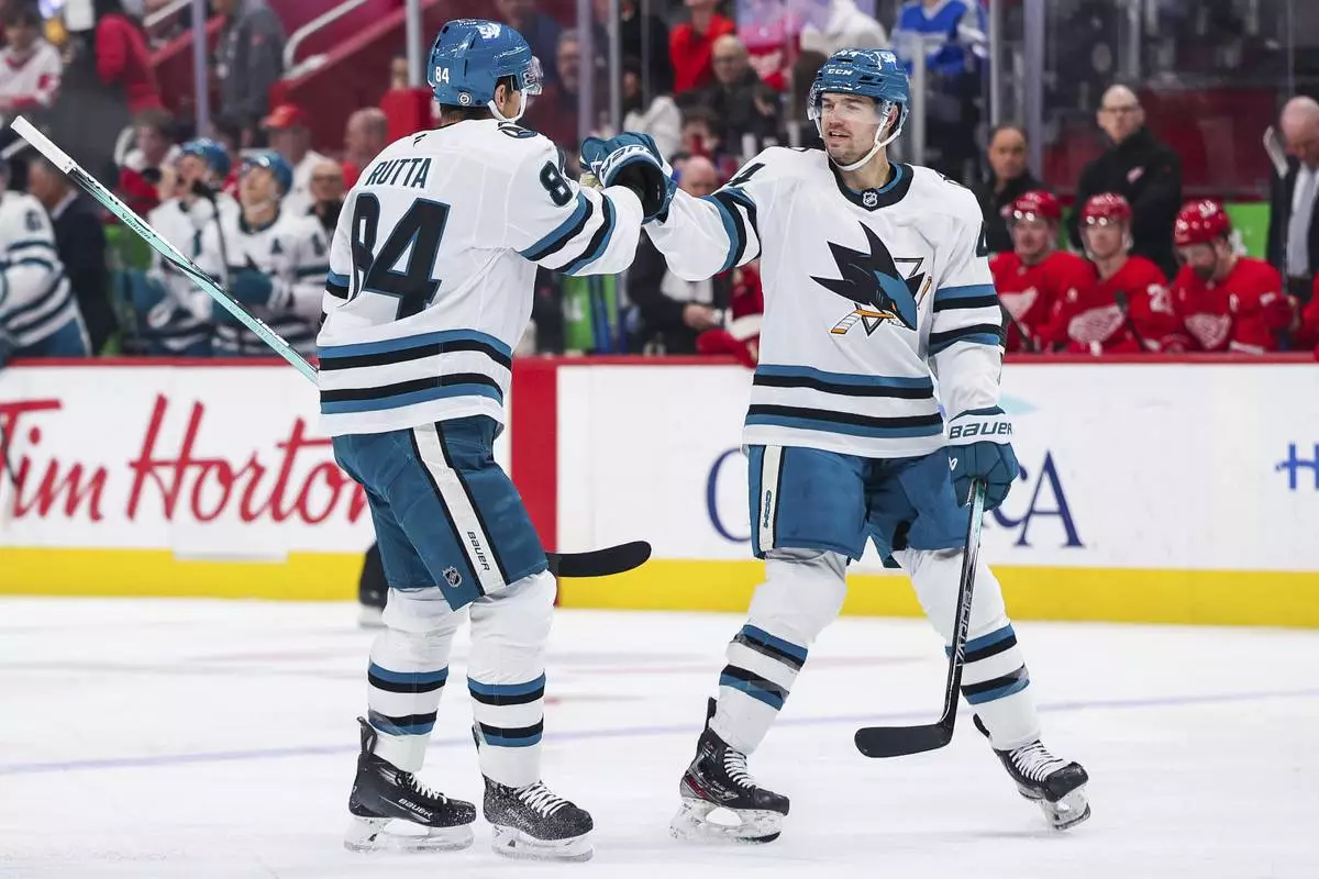 San Jose Sharks defenseman Cody Ceci (4) and San Jose Sharks defenseman Jan Rutta (84) celebrate after a goal to go up in the first period of an NHL hockey game against the Detroit Red Wings Tuesday, Jan. 14, 2025, in Detroit. (AP Photo/Mike Mulholland)