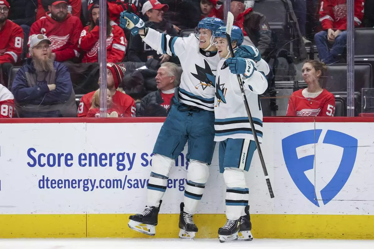 San Jose Sharks forwards Nico Strum and William Eklund celebrate after a goal in the first period against the Detroit Red Wings during an NHL hockey game, Tuesday, Jan. 14, 2025, in Detroit. (AP Photo/Mike Mulholland)