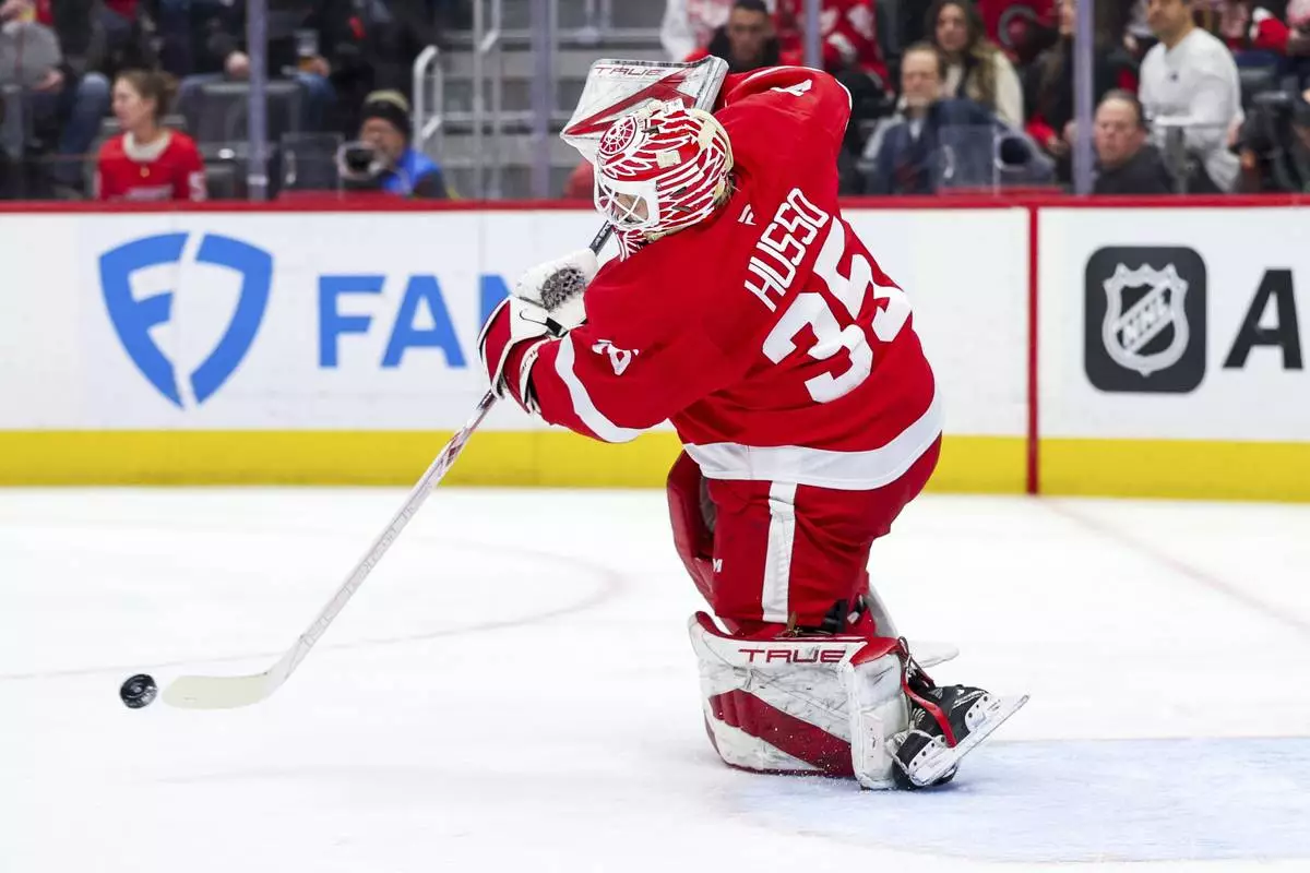 Detroit Red Wings goalie Ville Husso passes the puck away in the first period of an NHL hockey game against the San Jose Sharks on Tuesday, Jan. 14, 2025, in Detroit. (AP Photo/Mike Mulholland)
