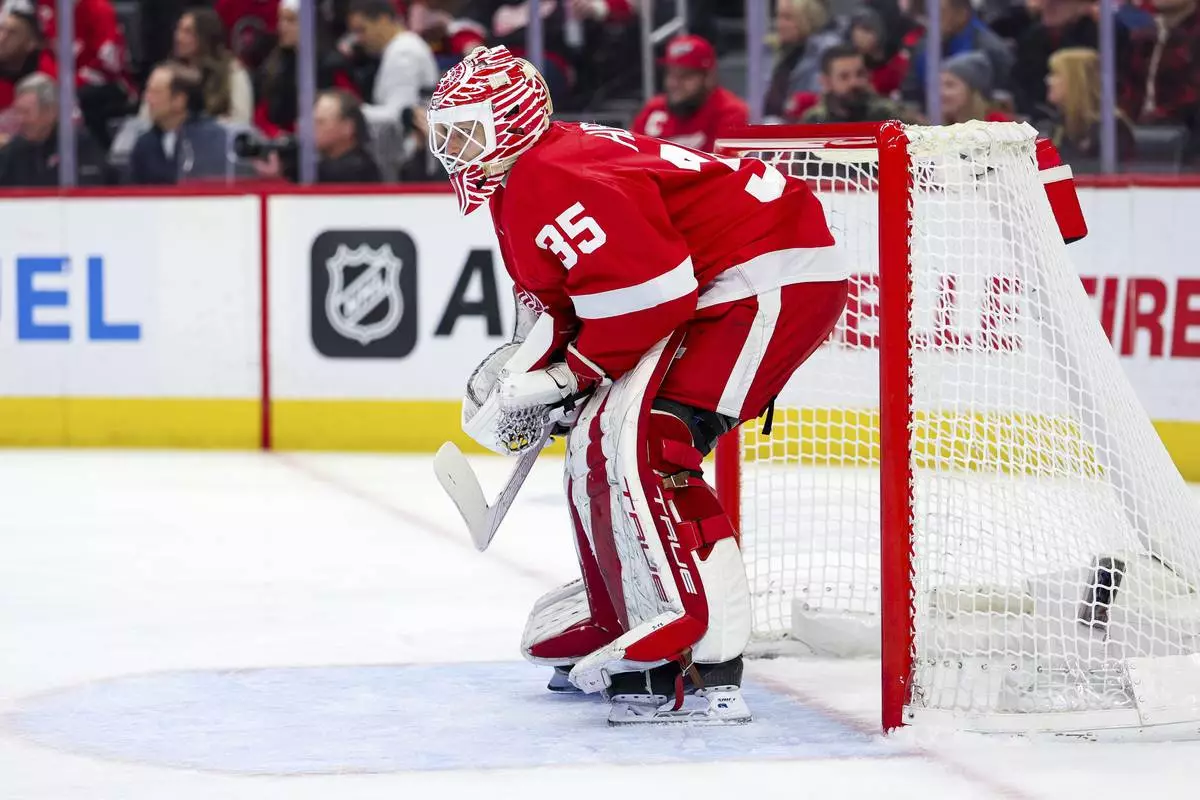 Detroit Red Wings goalie Ville Husso (35) looks on during the first period of an NHL hockey game against the San Jose Sharks, Tuesday, Jan. 14, 2025, in Detroit. (AP Photo/Mike Mulholland)