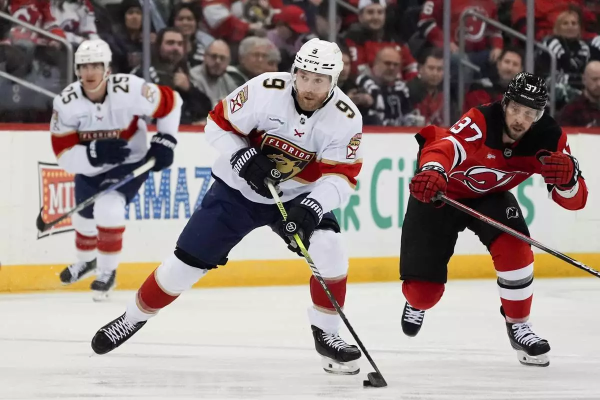 Florida Panthers center Sam Bennett (9), center, skates with the puck during the first period of an NHL hockey game against the New Jersey Devils, Tuesday, Jan. 14, 2025, in Newark, N.J. (AP Photo/Julia Demaree Nikhinson)