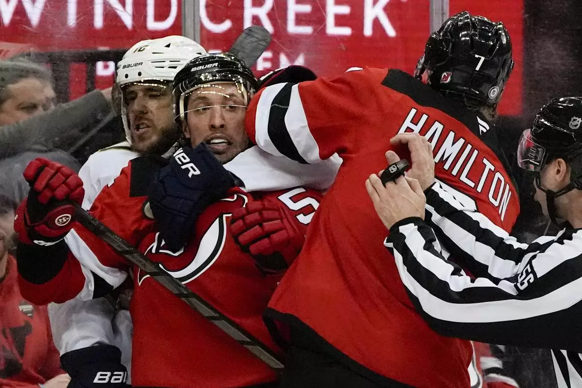 Florida Panthers left wing A.J. Greer and New Jersey Devils defensemen Brenden Dillon and Dougie Hamilton fight during the first period of an NHL hockey game, Tuesday, Jan. 14, 2025, in Newark, N.J. (AP Photo/Julia Demaree Nikhinson)