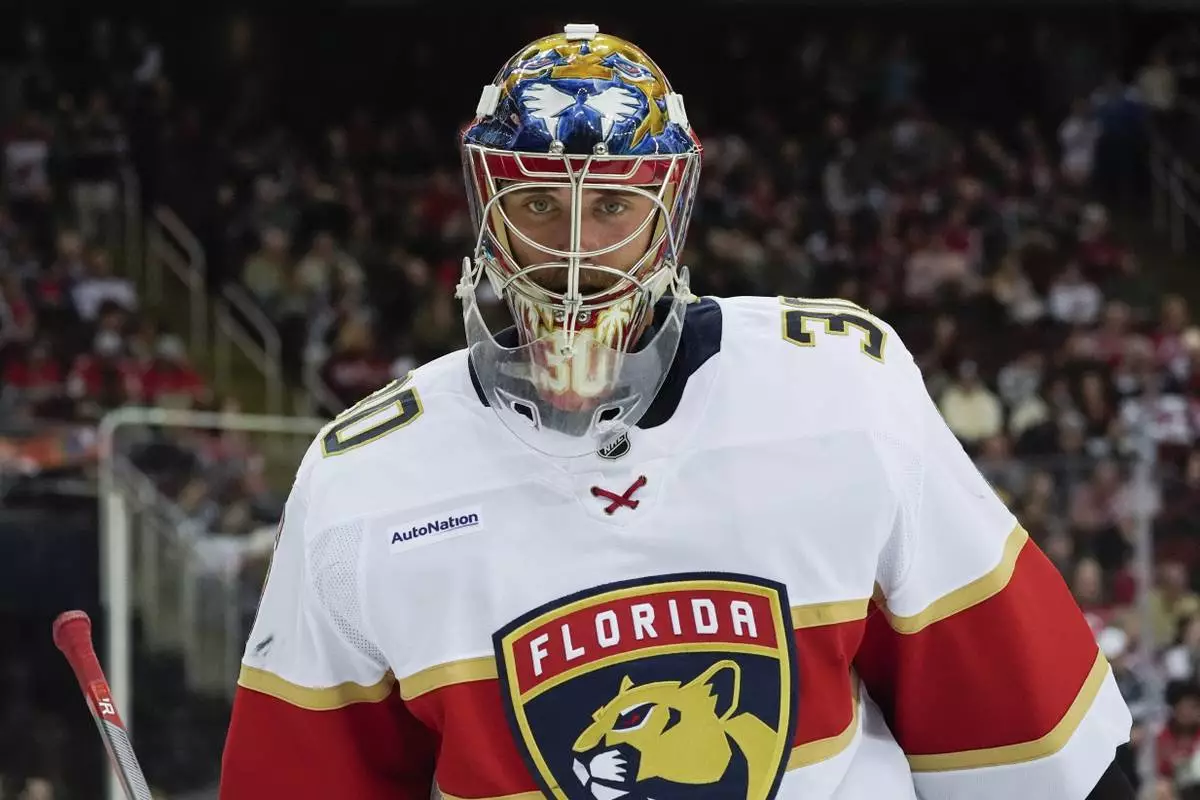 Florida Panthers goaltender Spencer Knight skates during the second period of an NHL hockey game against the New Jersey Devils, Tuesday, Jan. 14, 2025, in Newark, N.J. (AP Photo/Julia Demaree Nikhinson)