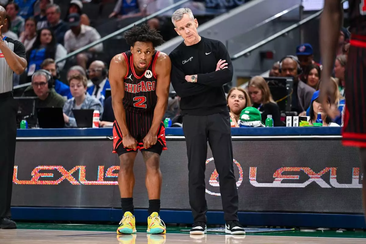 Chicago Bulls' Collin Sexton talks with Chicago Bulls head coach Billy Donovan during a time out in an NBA basketball game against the Dallas Mavericks Sunday, April 12, 2026, in Dallas. (AP Photo/Albert Pena)