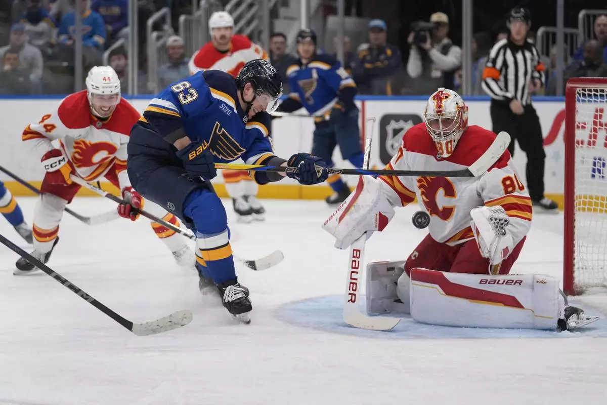 St. Louis Blues' Jake Neighbours (63) reaches for a loose puck as Calgary Flames' Joel Hanley (44) and goaltender Dan Vladar (80) defend during the second period of an NHL hockey game Tuesday, Jan. 14, 2025, in St. Louis. (AP Photo/Jeff Roberson)