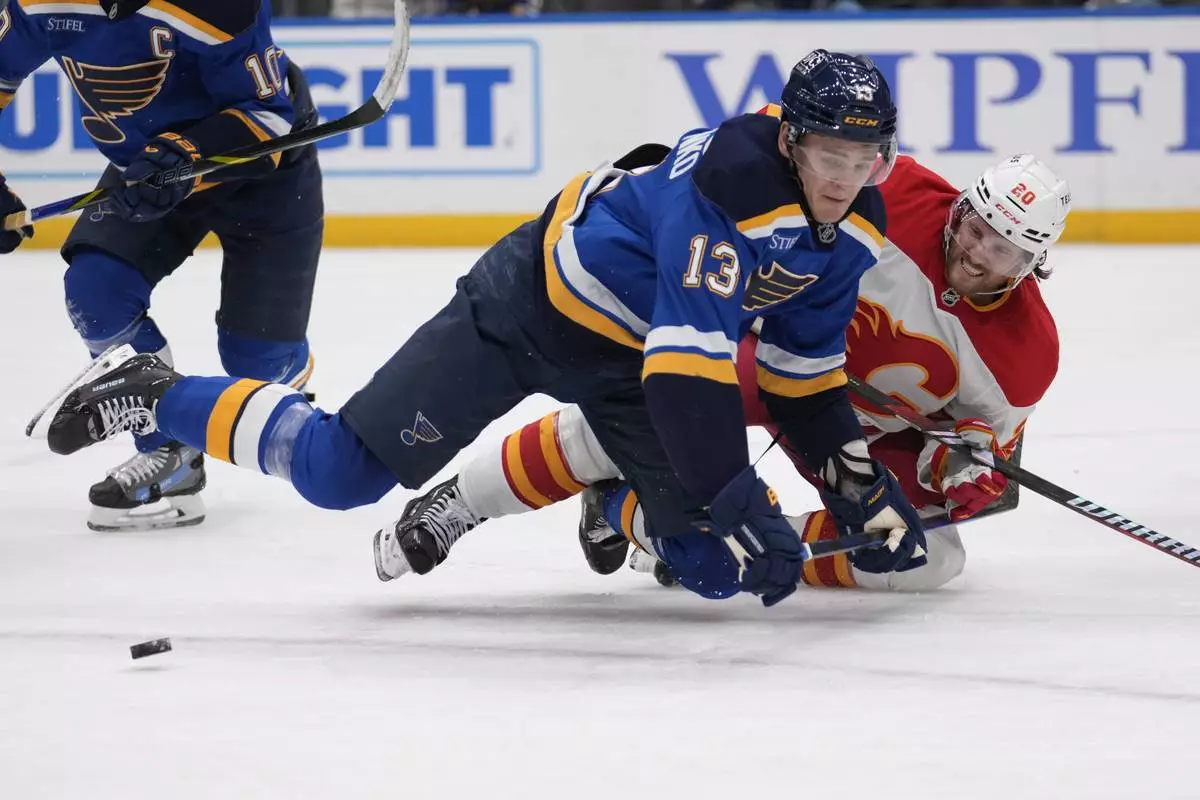 St. Louis Blues' Alexey Toropchenko (13) and Calgary Flames' Blake Coleman (20) battle for a loose puck during the third period of an NHL hockey game Tuesday, Jan. 14, 2025, in St. Louis. (AP Photo/Jeff Roberson)