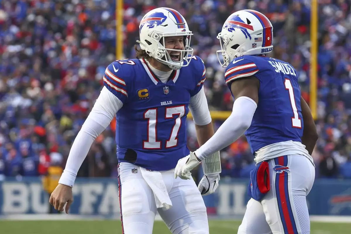 Buffalo Bills quarterback Josh Allen (17) celebrates with wide receiver Curtis Samuel (1) after Samuel scored a touchdown against the Denver Broncos during the fourth quarter of an NFL wild card playoff football game, Sunday, Jan. 12, 2025, in Orchard Park, N.Y. (AP Photo/Jeffrey T. Barnes)