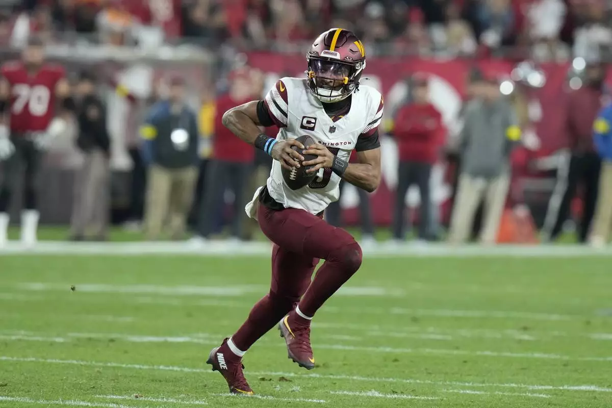 Washington Commanders quarterback Jayden Daniels (5) scrambles out of the pocket against the Tampa Bay Buccaneers during the first half of an NFL wild-card playoff football game in Tampa, Fla., Sunday, Jan. 12, 2025. (AP Photo/Chris O'Meara)