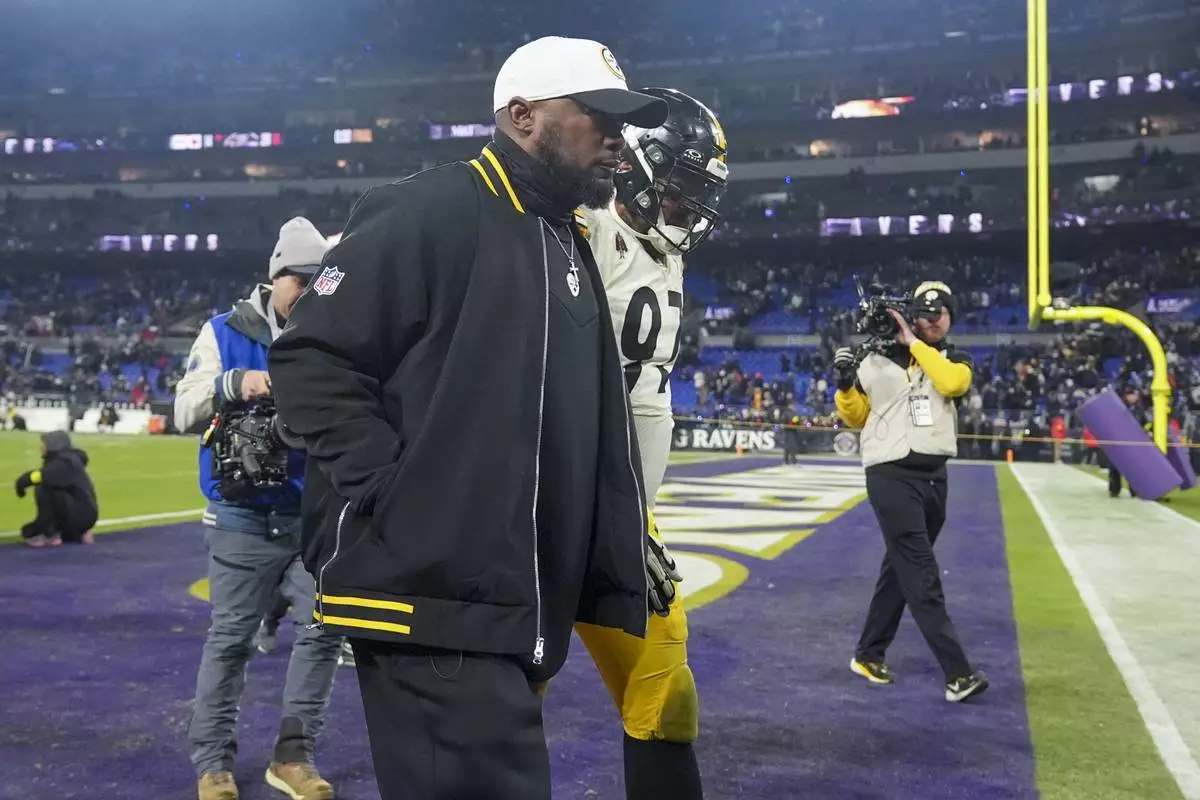 Pittsburgh Steelers head coach Mike Tomlin, center, walks off the field with defensive tackle Cameron Heyward (97) following an NFL wild-card playoff football game against the Baltimore Ravens, Saturday, Jan. 11, 2025, in Baltimore. The Ravens won 28-14. (AP Photo/Stephanie Scarbrough)
