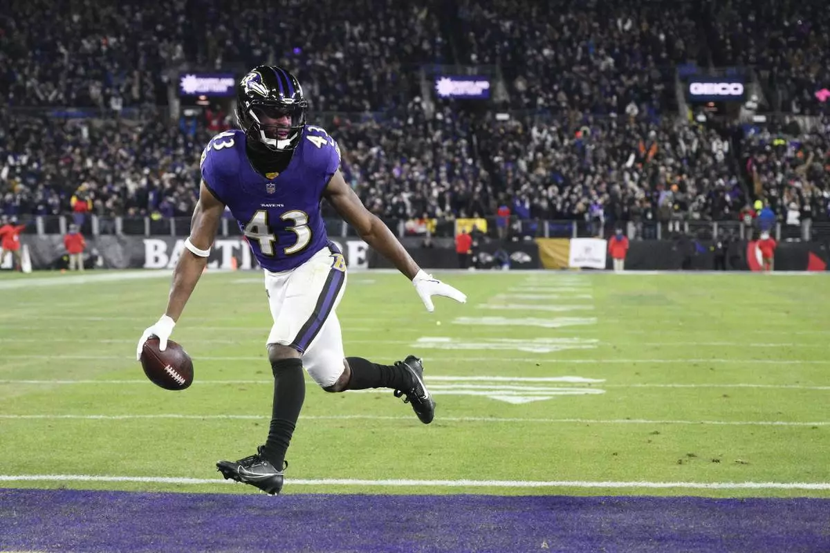 Baltimore Ravens running back Justice Hill scores on a pass from quarterback Lamar Jackson during the first half of an NFL wild-card playoff football game against the Pittsburgh Steelers, Saturday, Jan. 11, 2025, in Baltimore. (AP Photo/Nick Wass)