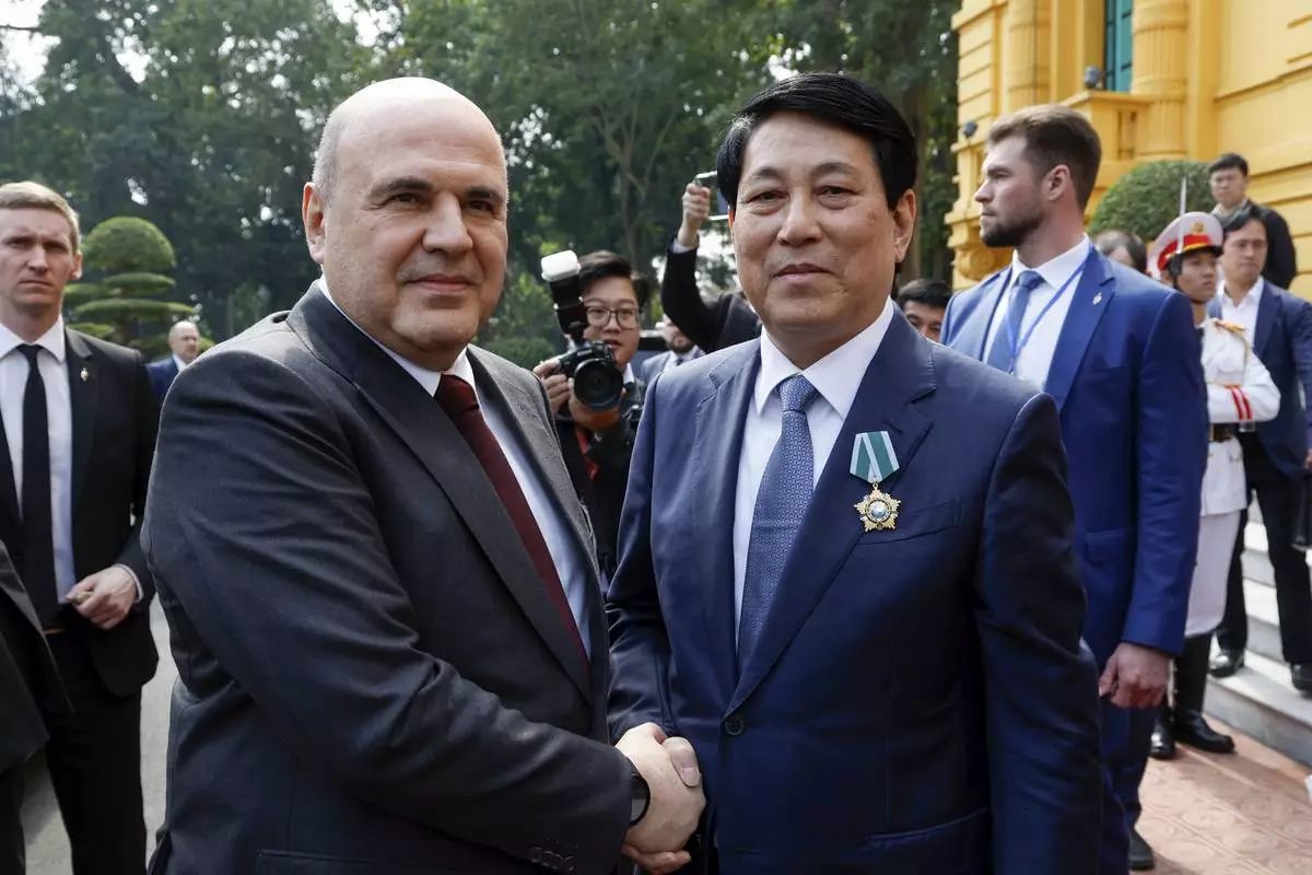 Russian Prime Minister Mikhail Mishustin, left, and Vietnamese President Luong Cuong awarded with the Russian Order of Friendship shake hands following a ceremony to present Russian state decorations to Vietnamese officials in Hanoi, Vietnam, Wednesday, Jan. 15, 2025. (Dmitry Astakhov, Sputnik, Government Pool Photo via AP)