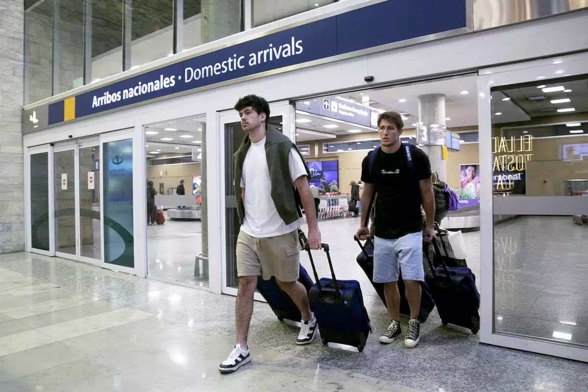 FILE - French rugby players Oscar Jegou, right, and Hugo Auradou arrive from Mendoza at the airport in Buenos Aires, Argentina, Aug. 27, 2024. (AP Photo/Virginia Chaile, File)