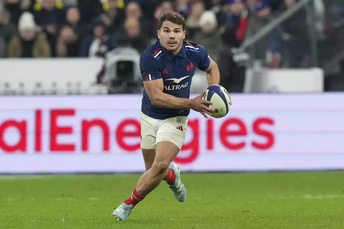 FILE - France's Antoine Dupont runs during the Autumn Nations Series rugby international between France and Argentina at the Stade de France stadium at Saint-Denis on the outskirts of Paris, Nov. 22, 2024. (AP Photo/Thibault Camus, file)