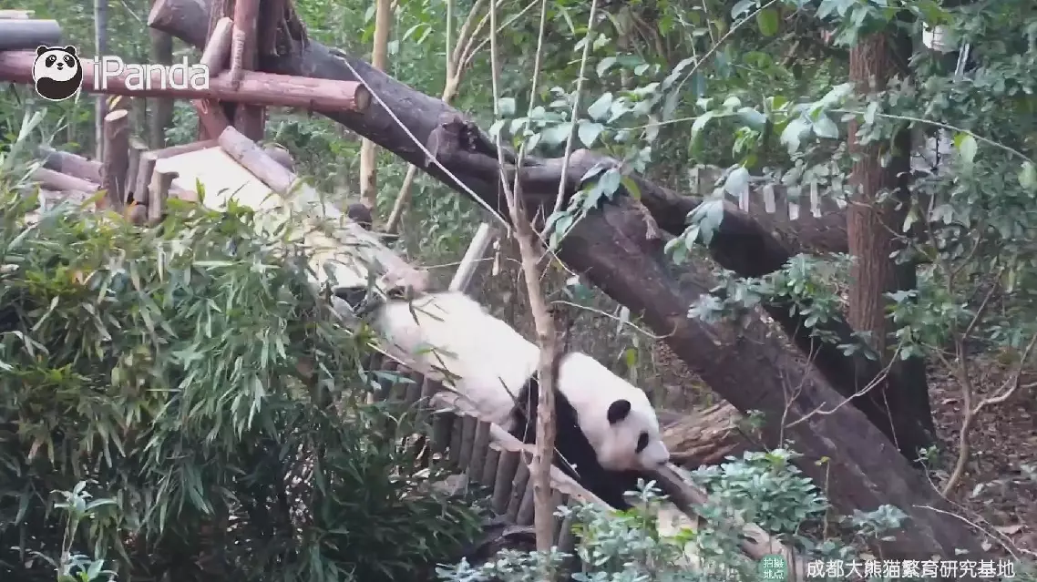 He Hua, the more adventurous of the twin panda sisters, is captured sliding down the slope on her belly, while her younger sister He Ye lounges nearby on a rack, looking relaxed. Meanwhile, another clip shows He Ye taking a more leisurely approach, gliding sideways down the slide while grasping a nearby tree, creating a heartwarming moment.
