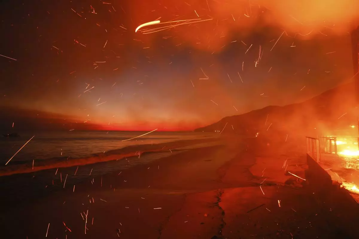 The Palisades Fire burns a beach front property Wednesday, Jan. 8, 2025 in Malibu, Calif. (AP Photo/Etienne Laurent)