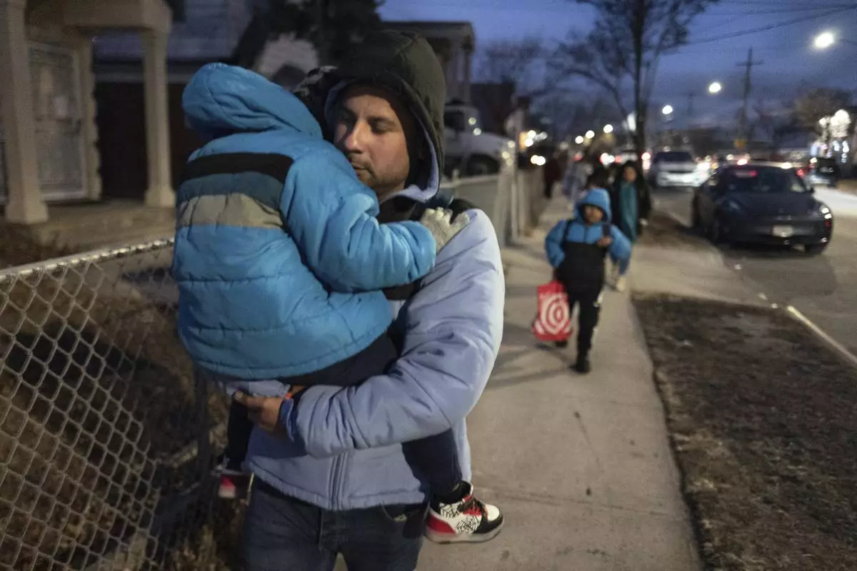 Gabriel Montilla carries his son after picking up his children from their school in the Flatbush neighborhood of Brooklyn and commuting with them to a shelter in the Jamaica neighborhood of the Queens borough of New York, Tuesday, Jan. 14, 2025. Montilla and his family were recently relocated to a migrant shelter in Queens after the family shelter at Floyd Bennett Field was closed. (AP Photo/Klaus Galiano)
